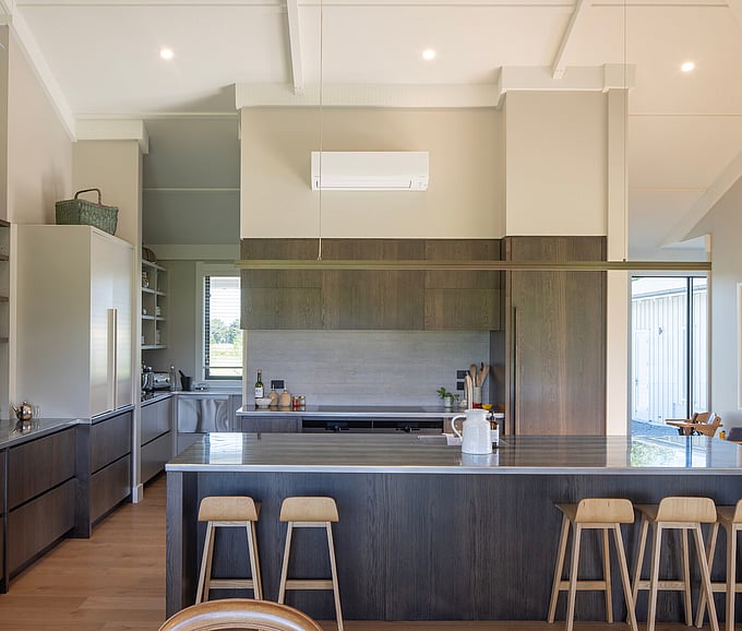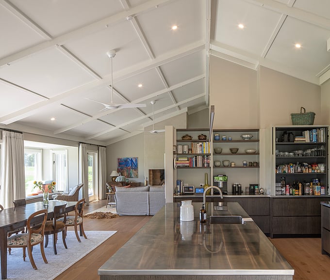The exterior blends traditional country character with modern refinement. Board and batten cladding, deep overhanging and complex eaves, exposed rafters and generous covered verandas reference the classic rural homestead, while clean lines and contemporary detailing give the home a fresh architectural edge. Carefully crafted soffits and outriggers, add depth and texture to the exterior detailing. The result is a home that feels timeless yet distinctly modern.